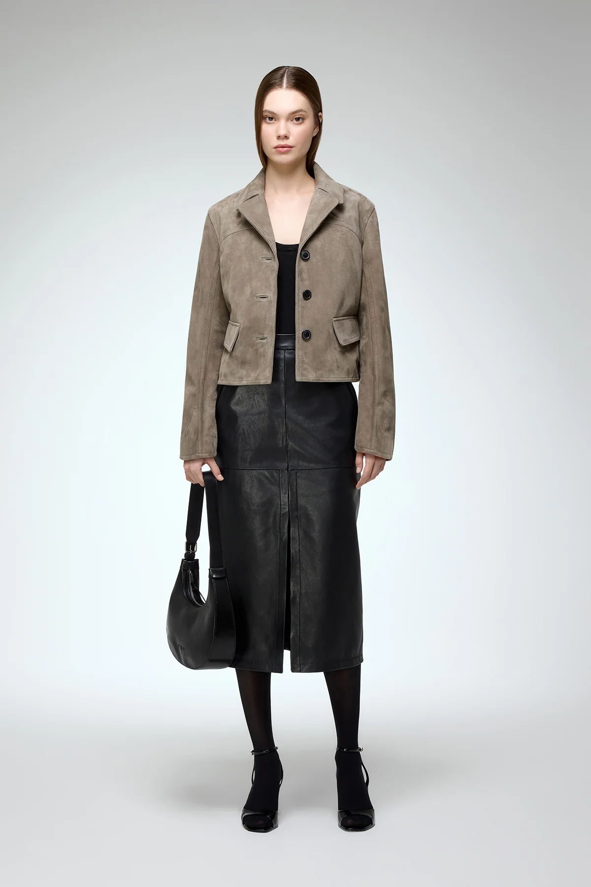 Cropped-length, boxy button-down blazer-style leather jacket with flap pockets and small lapel collar. Modern and structured look.