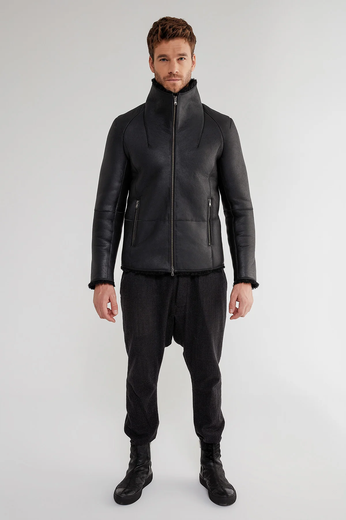Outside leather, inside shearling embellished biker jacket. Asymmetrical zipper closure and asymmetrical hem line. Leather straps with snap at hem and welt pockets with zipper at both sides. Soft touch.