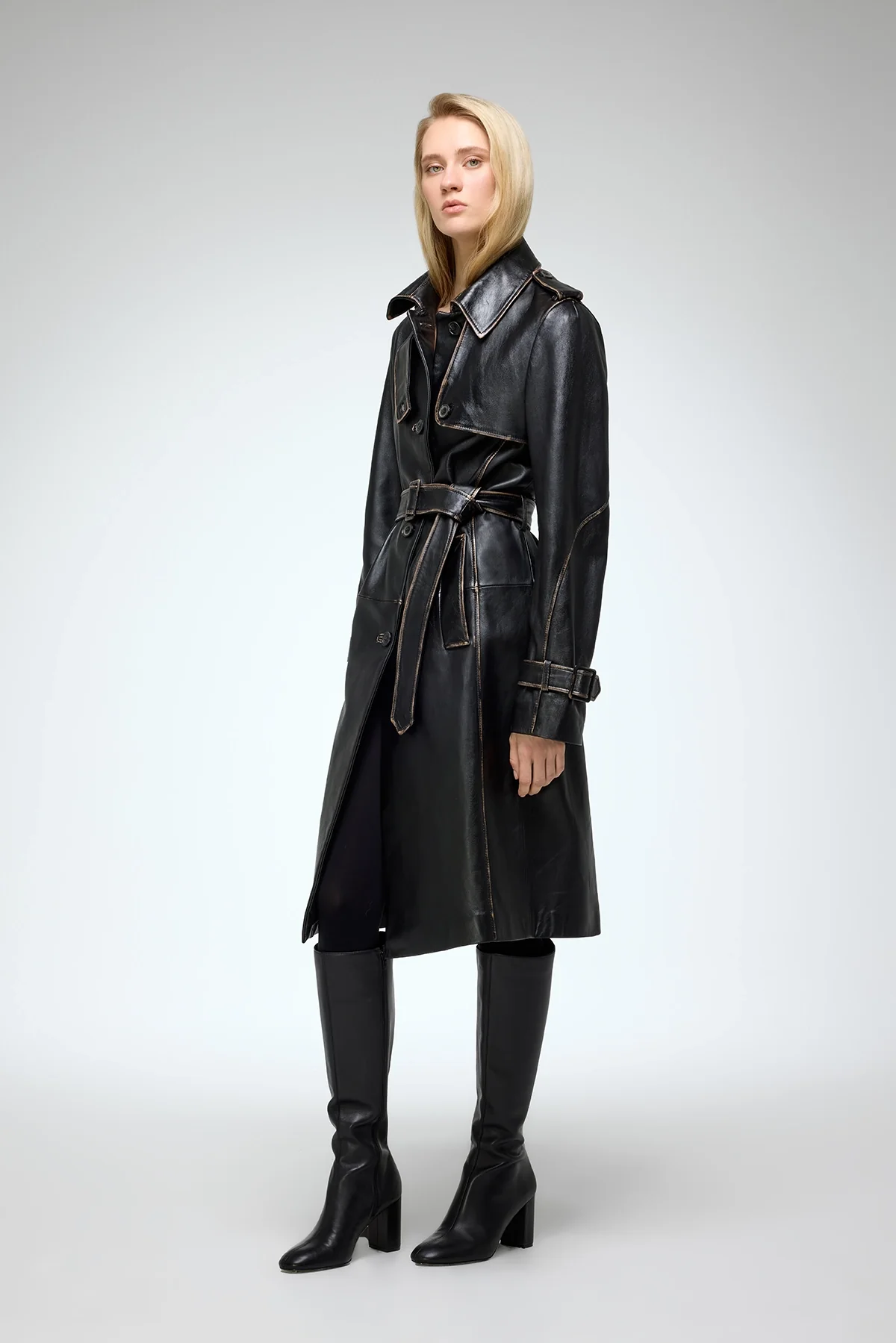 Single-breasted 100% lamb leather suede mid-length trench coat with a classic relaxed fit and belted waist. Features a single storm flap, welt pockets, detachable neck belt, shoulder tabs, and long sleeves with cuff strap details for a refined, timeless style.