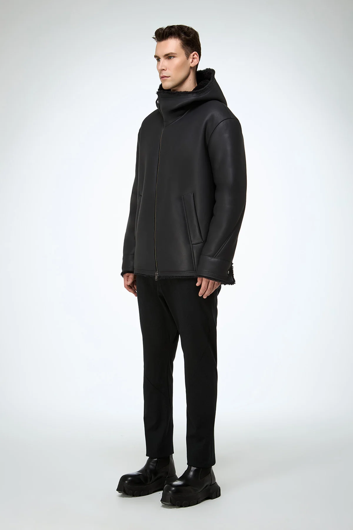 Lamb leather shearling jacket with relaxed fit. Button, asymmetrical front closure with double sided zipper. Diagonal pockets. Elevated funnel neck.